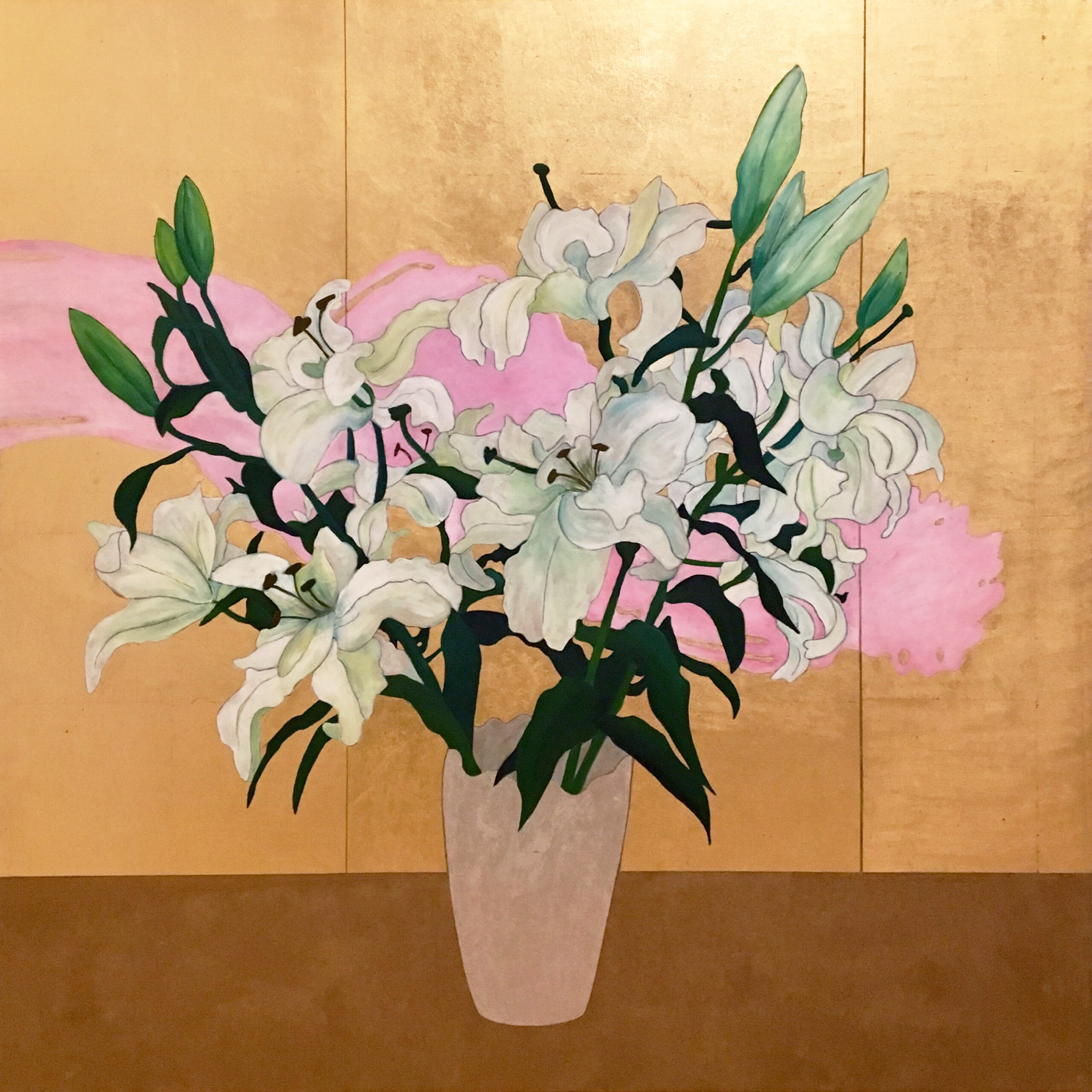 Piece is oil, schlagmetal and varnish on an HDF board, which is a visible part of the project. The whole thing is on a wooden frame.