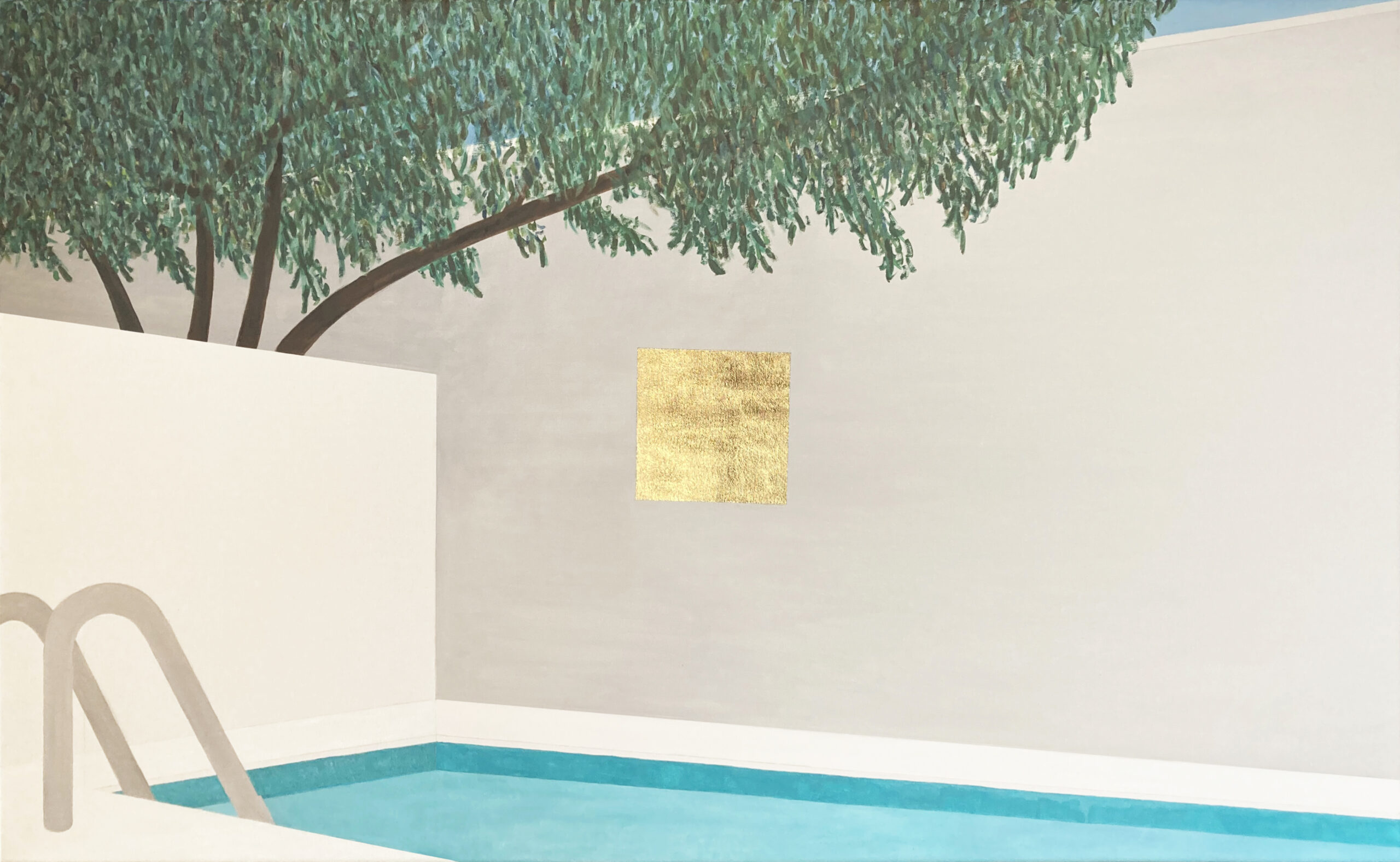 Pierwotny obraz "La Muela - Wytchnienie", na którym był tylko basen, mur i kawałek nieba, powstał w 2021r., jako trzeci z serii "Andaluzja". Miał być minimalistyczny, ale po pewnym czasie dotarło do mnie że to nie to - że jest nie tyle minimalistyczny, ale mu czegoś brakuje. W przypadku takich myśli stawiam obraz na sztaludze i patrzę ile się da. Po pewnym czasie doszłam do wniosku że nie może być Wytchnienia bez Drzewa. Zresztą tam za murem jest drzewo, tylko nieco inne. Wzięłam się za drzewo, ale Rosja najechała Ukrainę i wszystko było źle. To co wszyscy odczuwaliśmy, niemożność znalezienia sobie miejsca i zebrania myśli, przełożyło się na niezdolność do oceny własnej pracy. Wszystko źle i bez sensu.