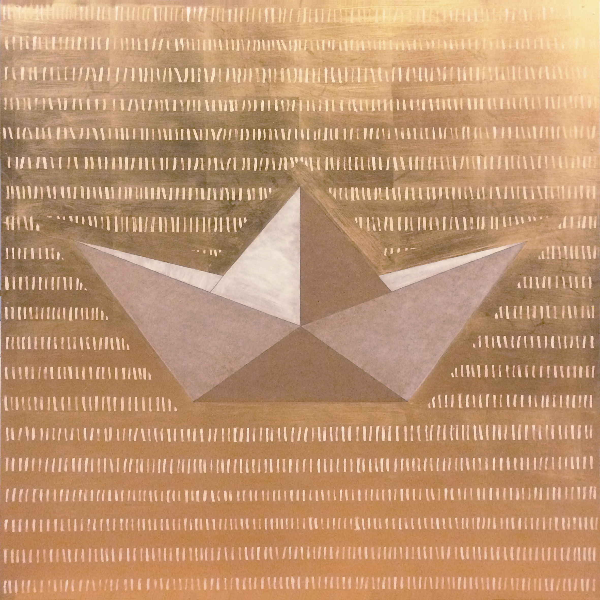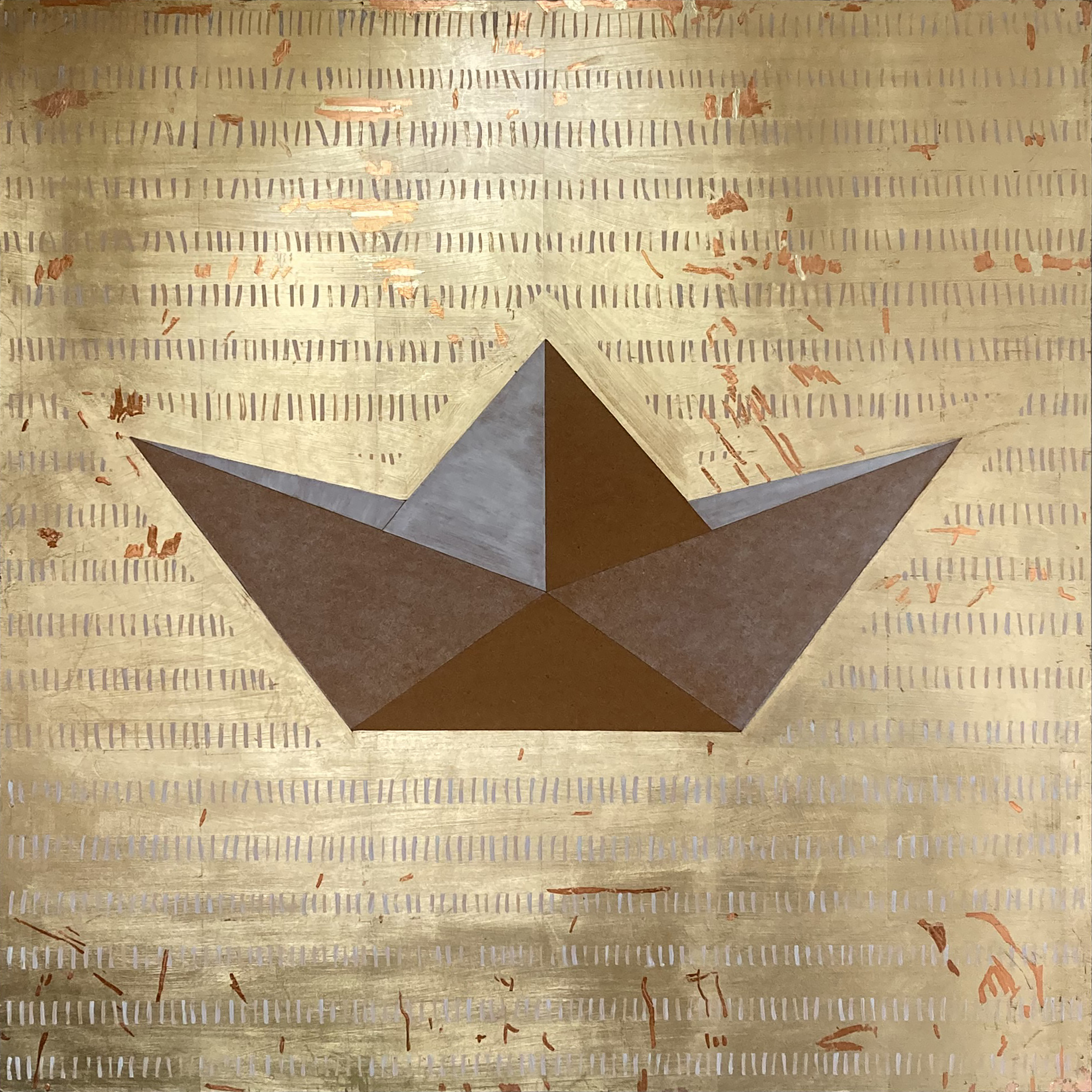 Historia jest taka, jak samo życie. Był piękny, stworzony z myśli o szczęśliwych chwilach z dzieciństwa kiedy robiliśmy z Tatą origami. 2 lata temu pożyczyła go pewna galeria żeby proponować klientom i wrócił totalnie porysowany... Gdy zwróciłam na to uwagę właścicielce była zdziwiona. No ale z właścicielkami galerii się nie zadziera, więc po prostu wrócił do magazynku i został wycofany ze sprzedaży. Żal mi go było bardzo. Potem rozmawiałam ze znajomą o kintsugi, czyli japońskiej filozofii naprawiania rzeczy złotymi "bliznami" i pomyślałam że tak właśnie chcę to wspomnienie naprawić. Ponieważ obraz sam w sobie jest złoty, blizny są miedziane.